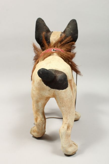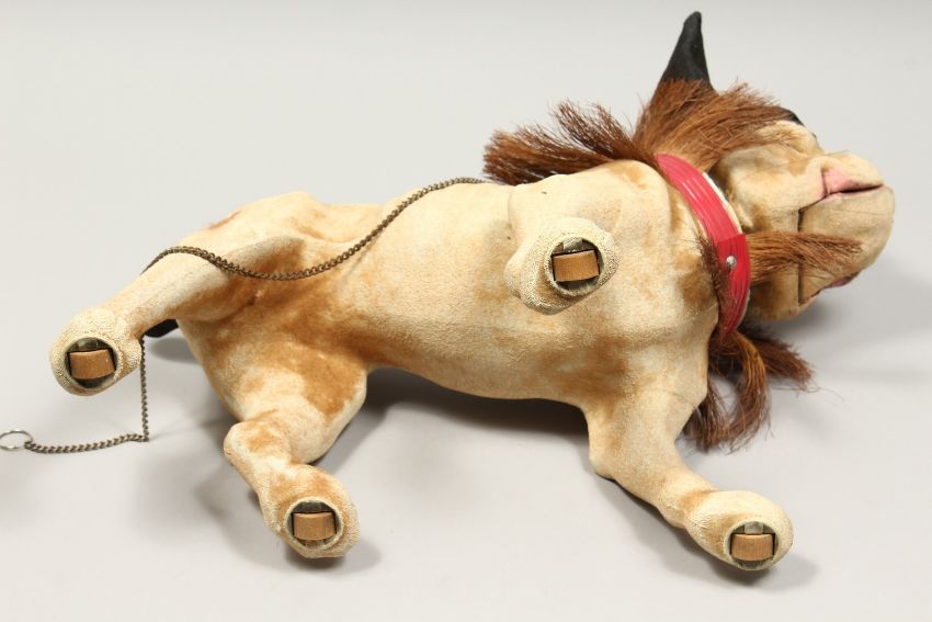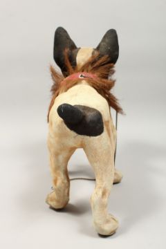 A GOOD VICTORIAN "BARKING" FRENCH BULLDOG with nodding head and articulated jaw, on four wheels, producing a "barking" sound when the chain is pulled.