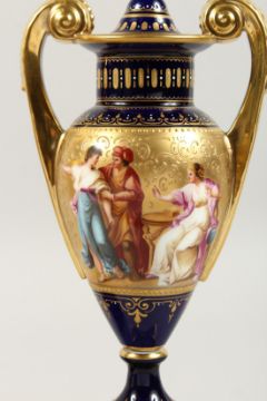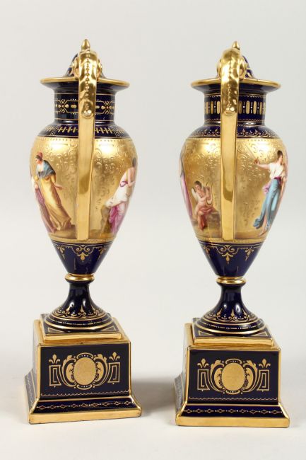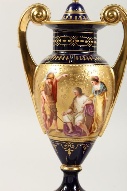 A VERY GOOD PAIR OF 19TH CENTURY VIENNA PORCELAIN TWO HANDLED URNS AND COVERS painted with classical scenes.