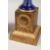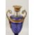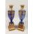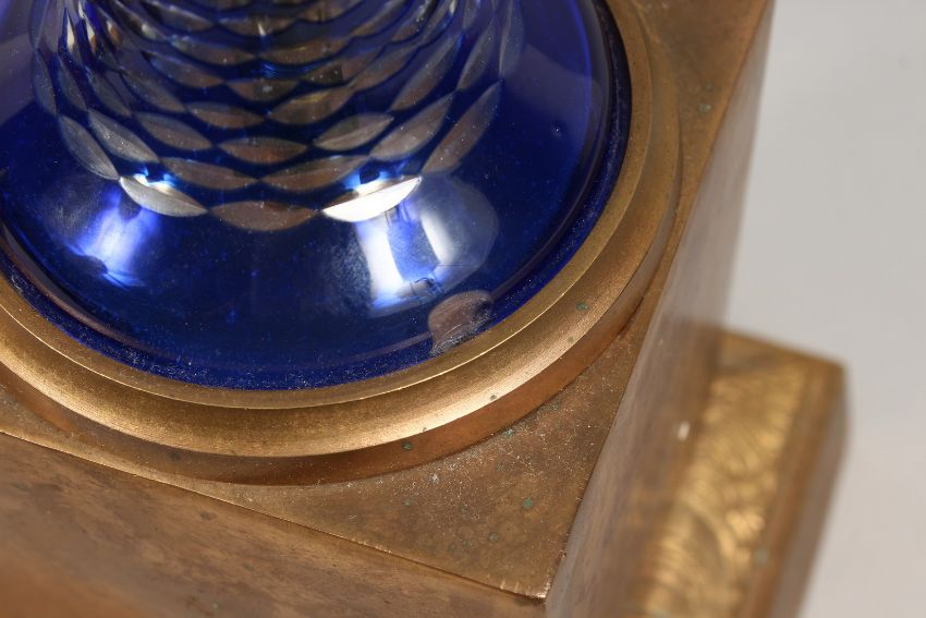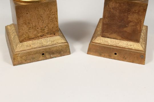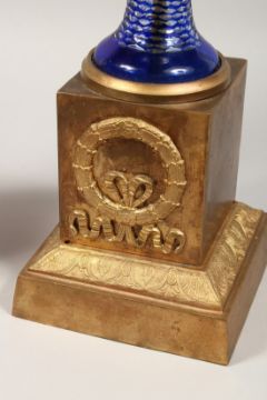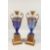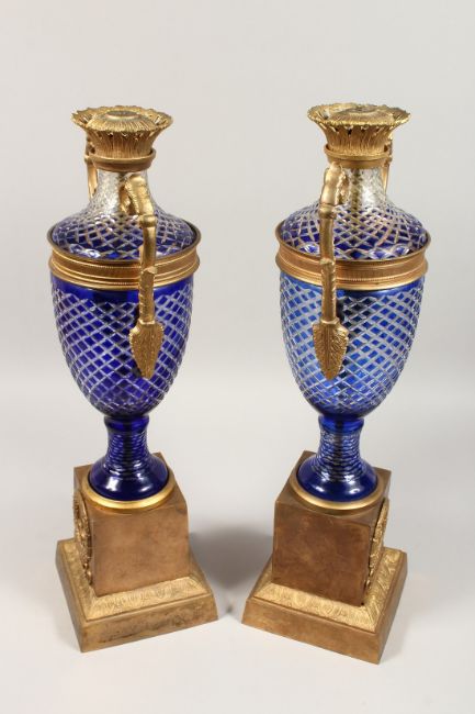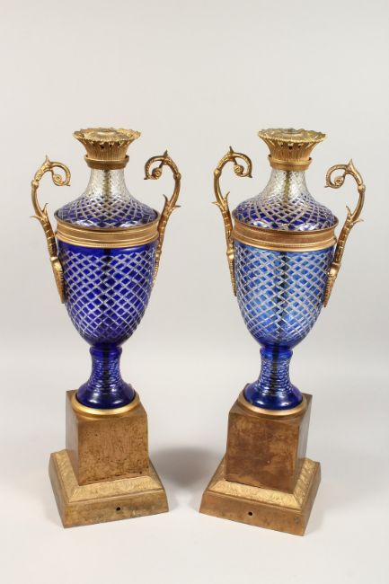 A LARGE PAIR OF BOHEMIAN CUT GLASS TWO-HANDLED VASES with blue overlay and gilt metal mounts on square metal bases.