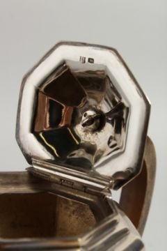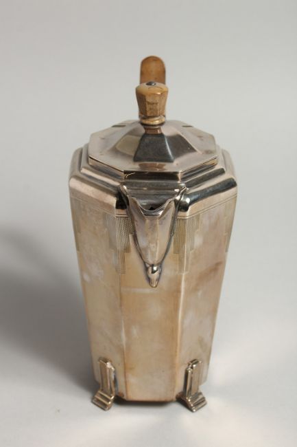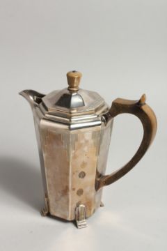 AN ART DECO DESIGN SILVER COFFEE POT with wooden handle and finial.