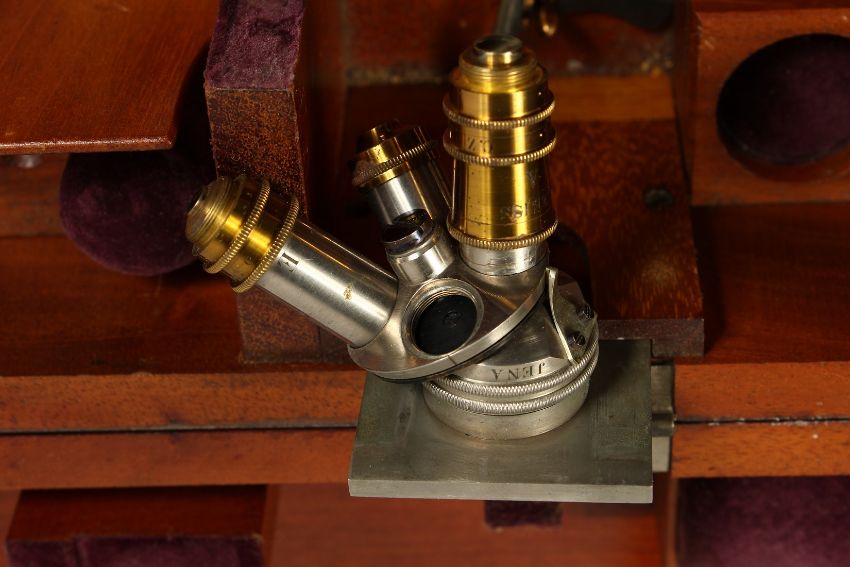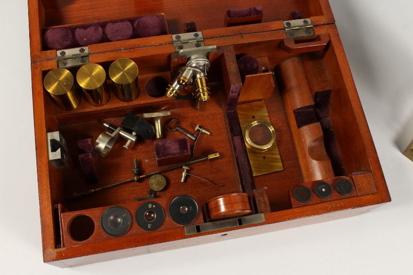 A GOOD VICTORIAN C. ZEISS JENA, NO.5945, MICROSCOPE with fittings in a mahogany case.