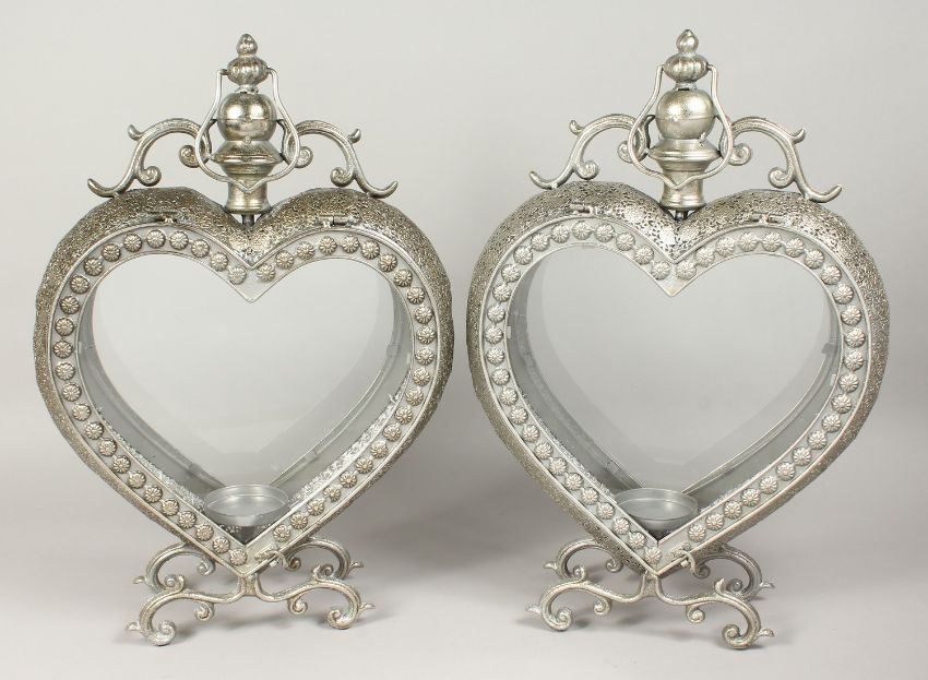 A PAIR OF SILVERED METAL HEART LANTERNS