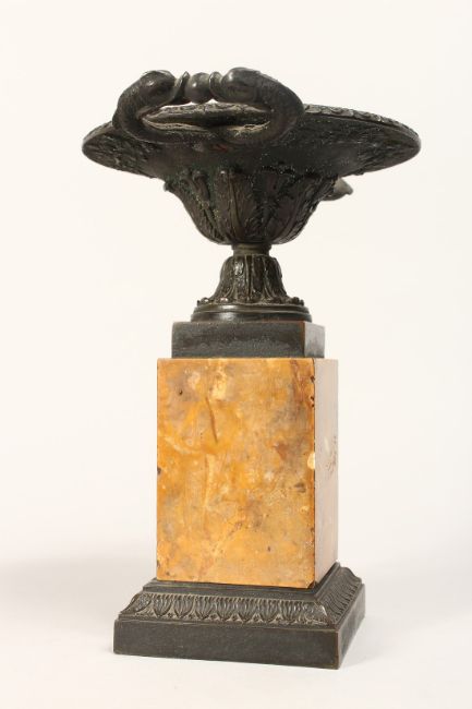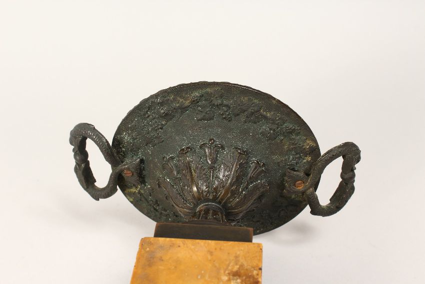 A REGENCY BRONZE TWO HANDLED CIRCULAR TAZZA on a marble plinth