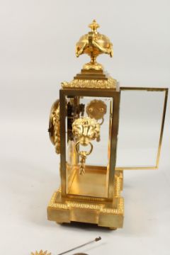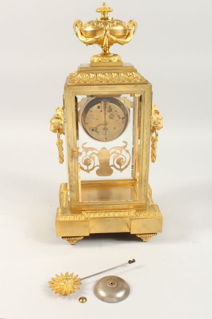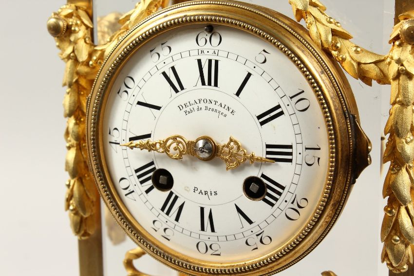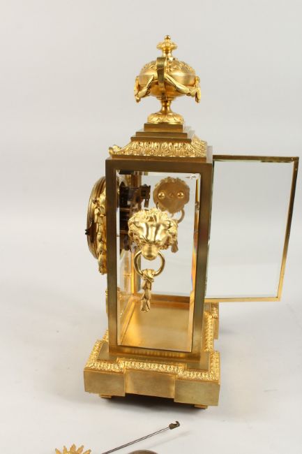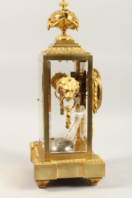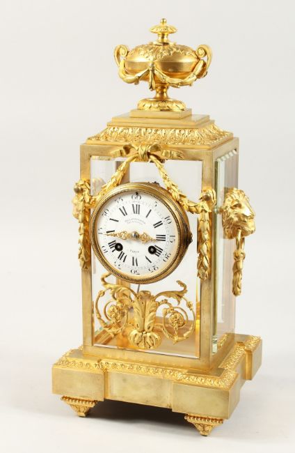 A VERY GOOD 19TH CENTURY FRENCH ORMOLU AND PORCELAIN FOUR GLASS CLOCK by DALAFONTIANE, Fab et Bronzes, Paris, with urn finials, garland and lion masks