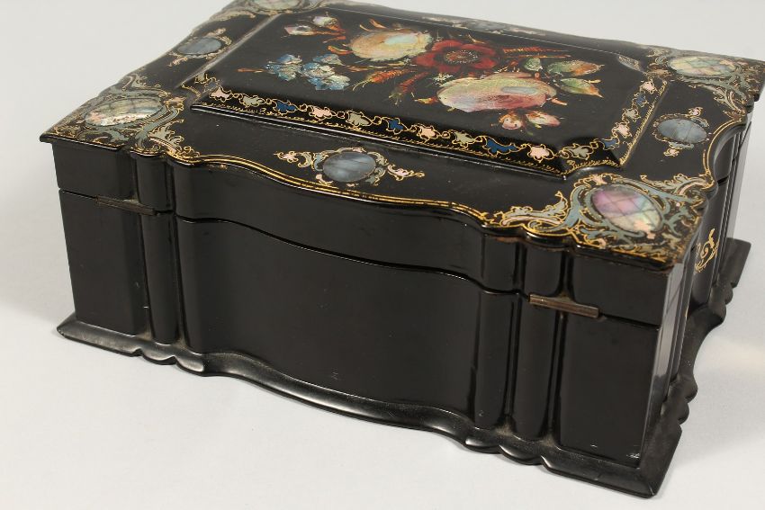A VICTORIAN PAPIER MACHE FITTED SEWING BOX inlaid with mother of pearl