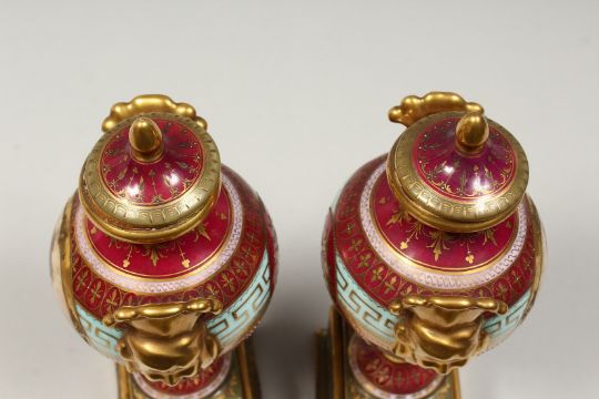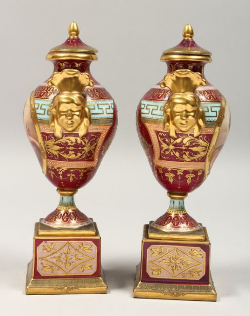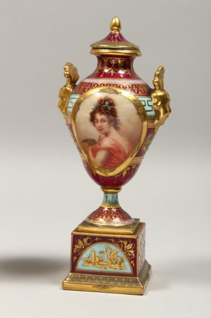 A VERY GOOD PAIR OF 19TH CENTURY VIENNA PORCELAIN TWO HANDLED URNS AND COVERS painted with portraits of young ladies.