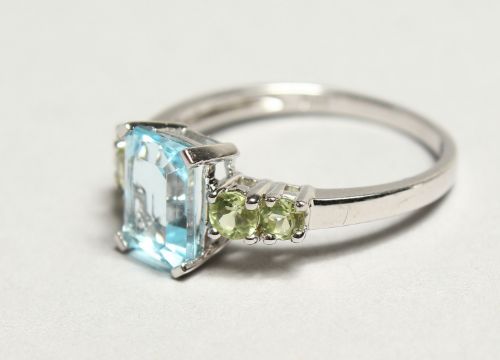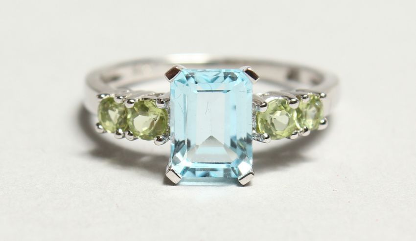 A SILVER AND AQUAMARINE FIVE STONE RING