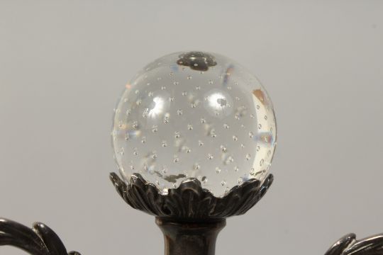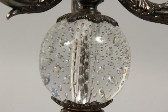 PAIRPOINT - A GOOD PAIR OF SILVER PLATED, GLASS AND ALABASTER CANDELABRA, with three scrolling branches, glass sphere finials and body on an hexagonal alabaster base. Stamped Pairpoint.