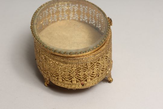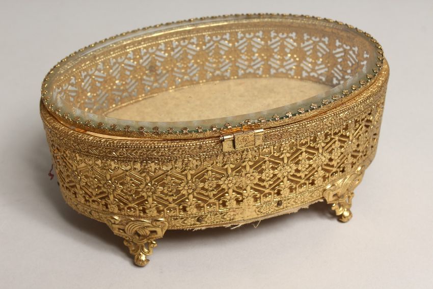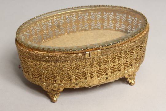 A FRENCH OVAL GILDED METAL JEWEL BOX AND GLASS COVER