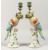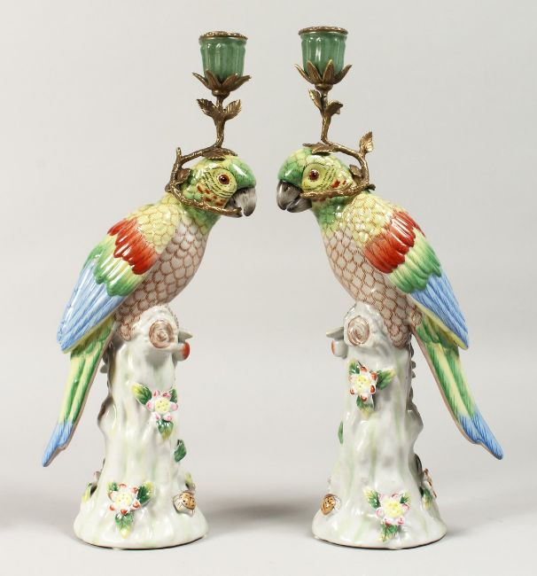 A PAIR OF PARROT PORCELAIN AND METAL CANDLESTICKS