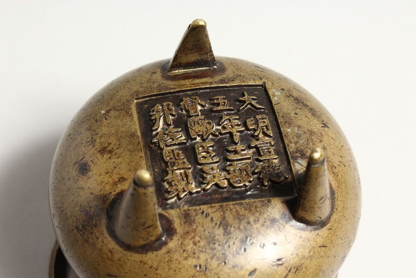 A CHINESE BRONZE TWO HANDLED CENSER with 16 marks.