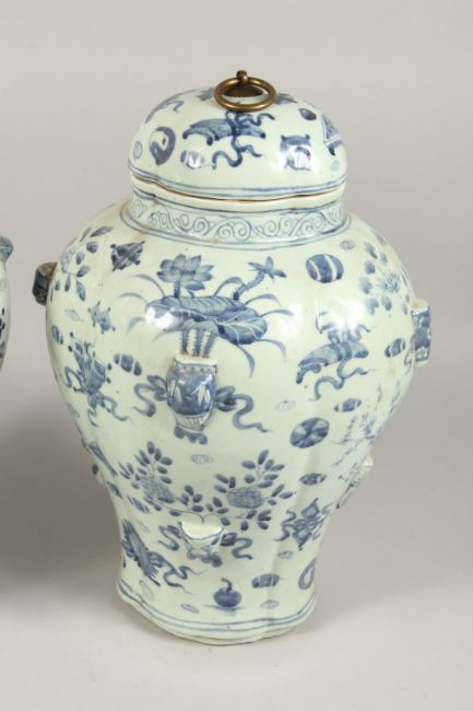 A PAIR OF BLUE AND WHITE CHINESE VASES AND COVERS