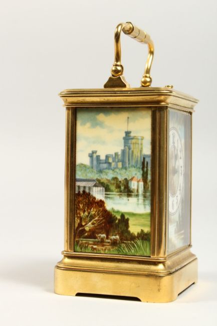 A VERY GOOD 19TH CENTURY FRENCH REPEATER CARRIAGE CLOCK with two painted porcelain panels and face including a scene of Windsor Castle. No. 1184.
