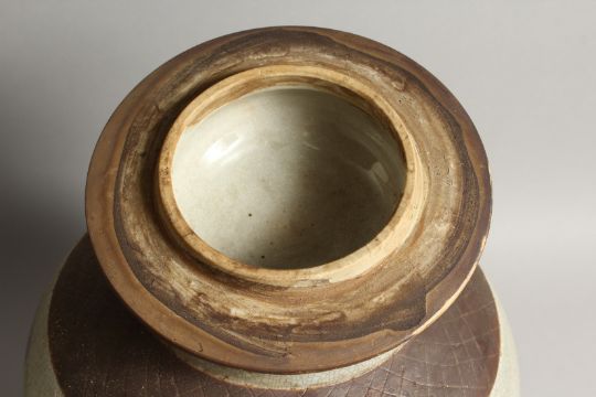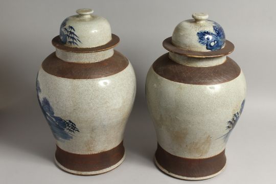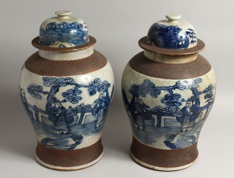 A PAIR OF CHINESE BLUE AND WHITE TEMPLE JARS AND COVERS