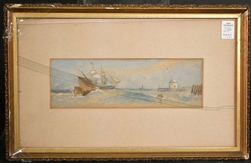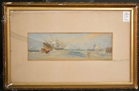 Circle of Albert Ernest Markes (1865-1901) British, a sailboat off a headland, 4.75" x 10", and another similar, 3.25" x 10", (2).