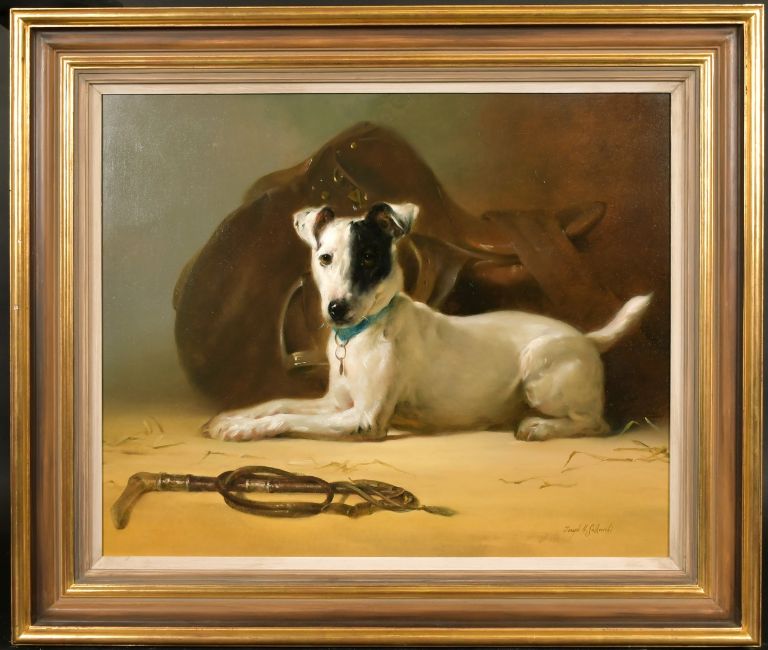 Joseph H. Sulkowski (Born 1951) Jack Russell with a riding saddle, oil on board, signed, 20" x 24". Provenance: Halcyon, label verso.