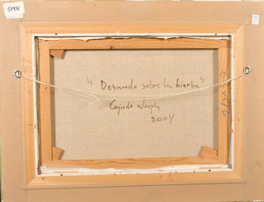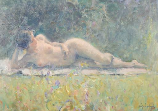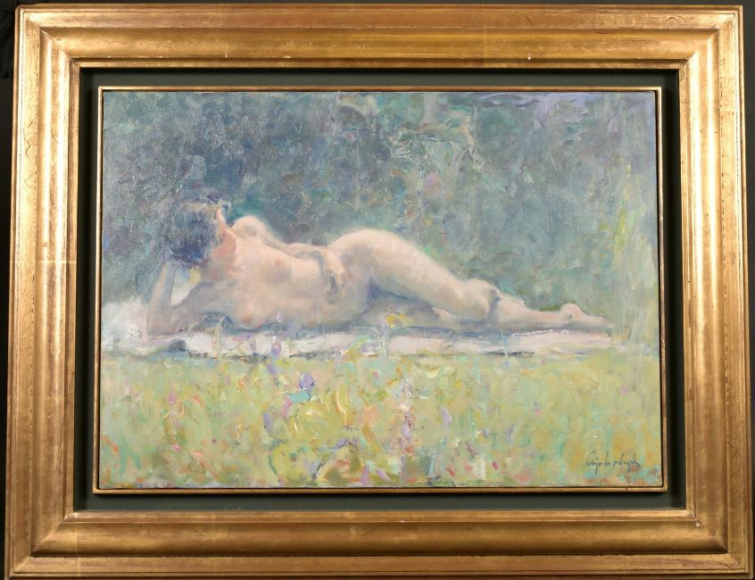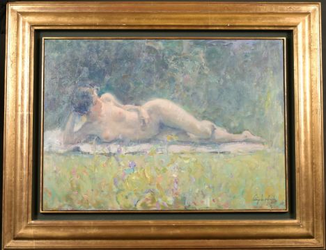 Ricardo Cejudo Nogales (b.1952) Spanish, 'Desnudo Sobre la Hierbe', a recumbent female nude, oil on canvas, signed, 18" x 25.5".