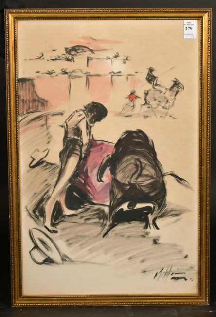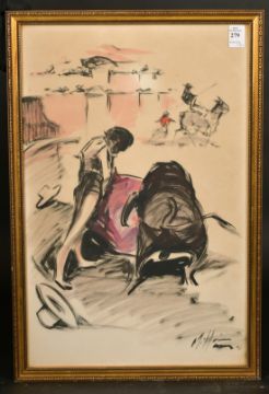 A group of three watercolours of bull fighting scenes, indistinctly signed, 20" x 13" (3).