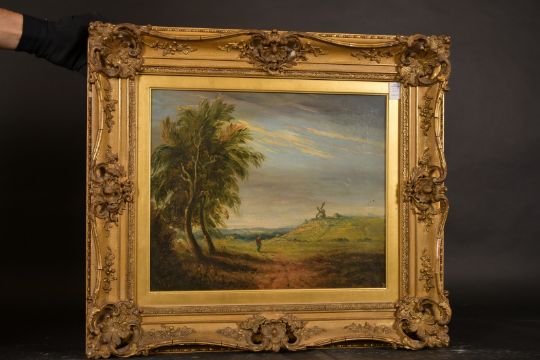 David Cox (19th Century) British, a wayfarer in a landscape with a windmill beyond, oil on canvas, signed and indistinctly dated, 15" x 18", in a fine gilt composition frame.