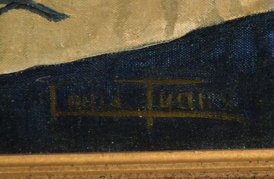 Louis Tounux? An interior Chinese scene with figures and sword, oil on canvas, signed, 21.5" x 28.75".