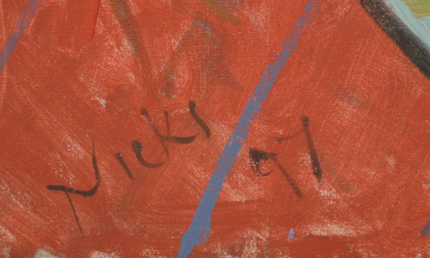 Kanwaldeep Singh Kang, signed Nicks, (1964-2000) British, a female nude in stockings in a colourful interior, oil on canvas, signed and dated 97, 30" x 25", unframed, from the artist's studio collection.