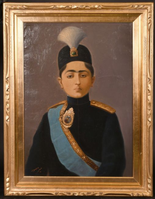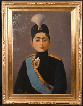 Mir Musavar (Mir Sayyid Husayn Arjangi) Persian School, circa 1910, A portrait of Ahmad Shah Qajar, Shah of Iran AH 1327-1344 (1909-1925), oil on canvas, signed, 27.5" x 19.75". A similar painting sold for 7500 pounds sterling (hammer price) at Christies London 15 October 2002.
