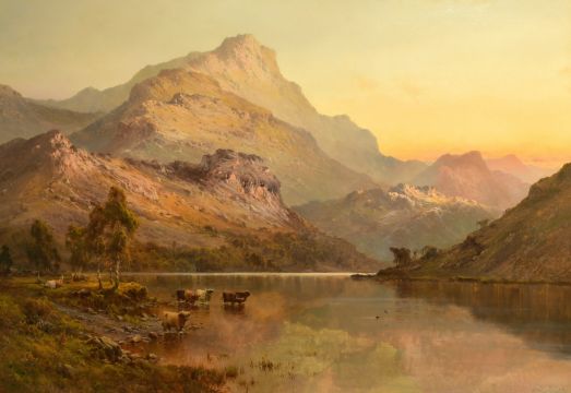 Alfred De Breanski (1852-1928) British, 'The Grampians', cattle watering in a loch at Dusk, oil on canvas, signed, 36" x 51", in a fine gilt composition frame, Provenance: Frost and Reed.