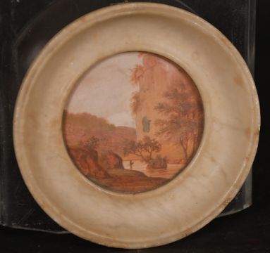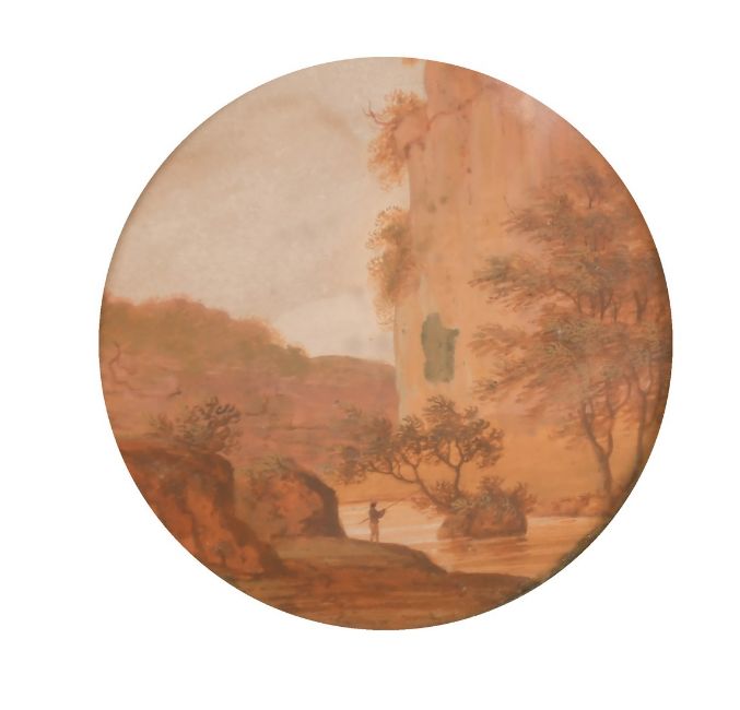 18th/19th Century School, a view of a fisherman in a gorge, watercolour, 3" diameter, in an alabaster frame.
