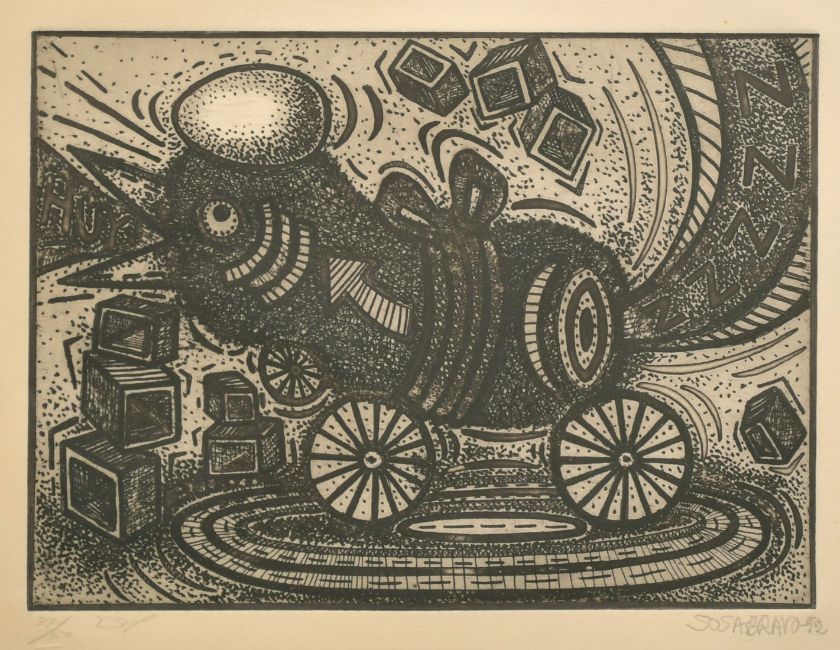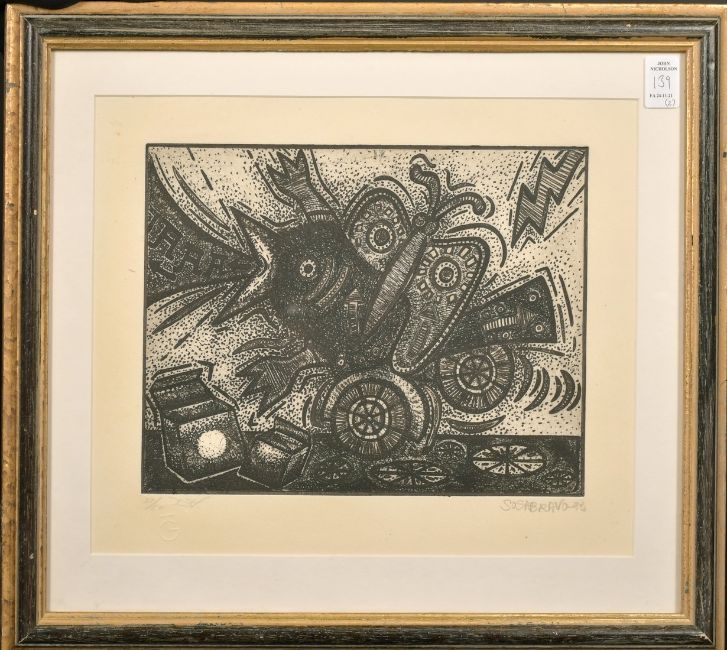 Alfredo Sosabravo, (Cuban) A bird on wheels crashing through bricks, A bird on wheels with a butterfly lithograph, numbered 37/50, blindstamp, signed and dated '92, 8" x 11". (2).