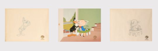 Warner Brothers Production Art 1994, 'Daffy Ducks Quackbusters', three illustrations of Daffy Duck and Porky Pig, Certificate of Authenticity verso, each stamped and 8.5" x 11.5".