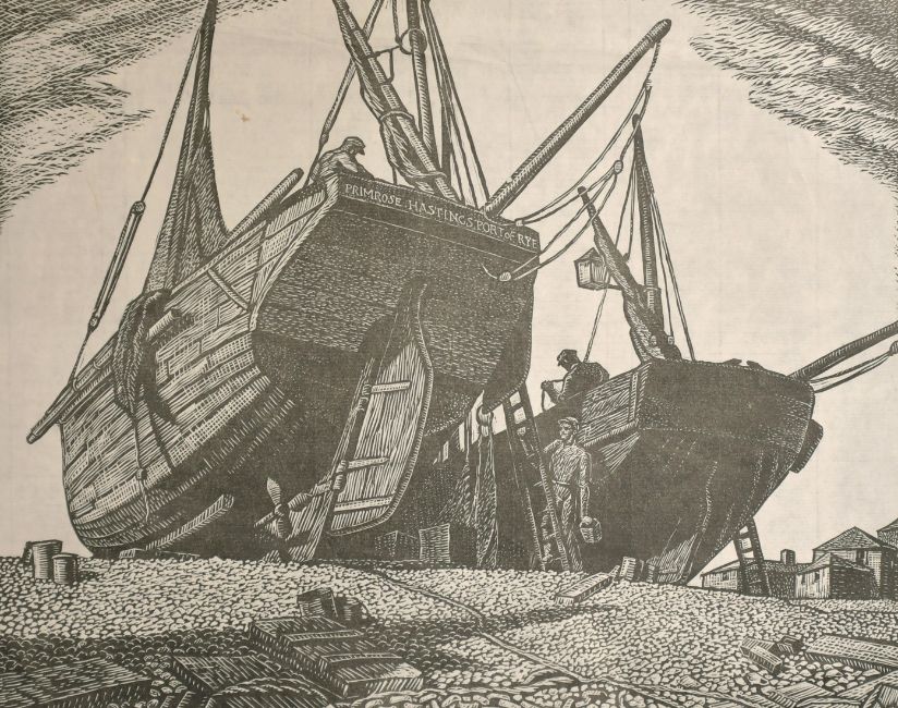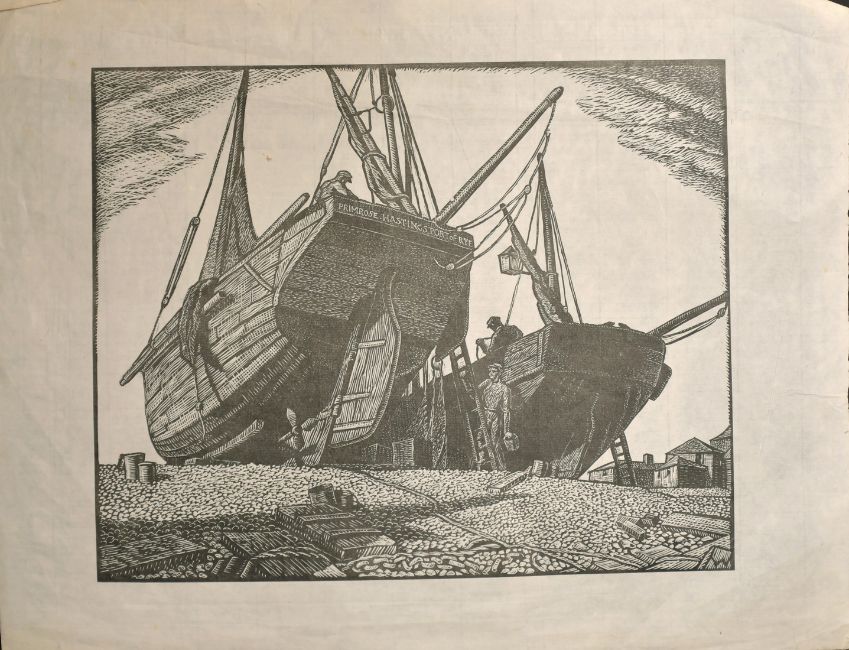 Leslie Moffat Ward (1888-1978) British, 'Primrose, Hastings, Port of Rye', figures by beached fishing boats, print, 10" x 12.75" unframed.