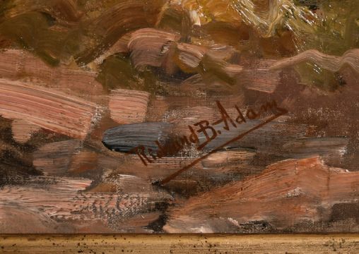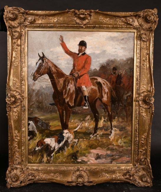 Richard Benno Adam (1873-1937) German, A scene of huntsmen and their hounds in a open field, oil on canvas, signed, 29.5" x 23.5", in a fine gilt composition frame.