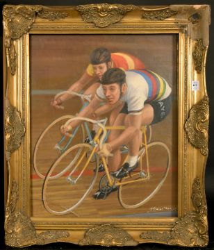 Pietro Psaier (1936-2004), a scene of Tom Simpson riding in a velodrome with another cyclist, oil on canvas, signed and dated 67, 30" x 25".