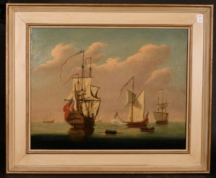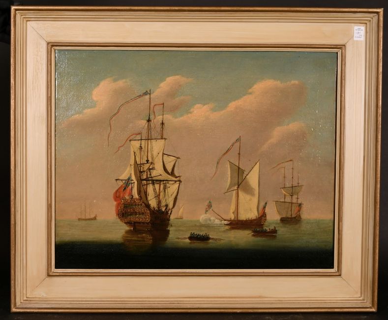 Circle of Peter Monamy, A pair of maritime scenes of Man-O-War with other shipping, oil on canvas, 20" x 25.25". (2).