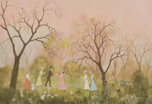 After Helen Bradley, Figures and flowers in a garden, colour print, 14" x 21".