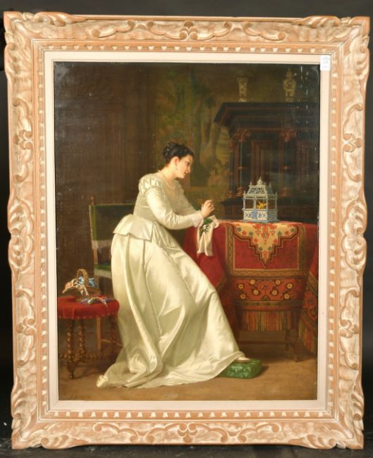 J. Berlin (19th /20th Century) Belgian, An elegant lady in a lavish interior gazing at a caged bird, oil on mahogany panel, signed, in a carved wood frame, 28.75" x 22.5".