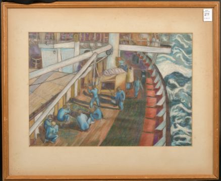 20th Century School, Scene of crew at work on a large vessel, pastel, indistinctly signed, 11.5" x 16.5".