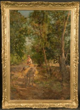 Eduardo Matania (1847-1929) Italian, A young woman on a donkey on a sunlit woodland path, oil on canvas, signed, 26" x 18".