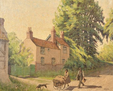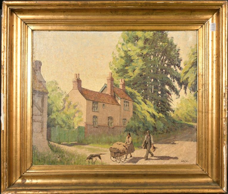 Will Cross, British, 'Black Bess and Smokey Joe', Figures and dog on a lane outside a house, oil on board, signed, titled on label verso, 20" x 24".