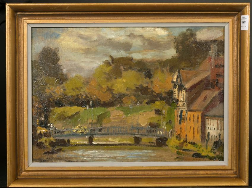 O. Brabbins, Houses next to a river with bridge and landscape beyond, oil on board, signed, 12" x 16.5".