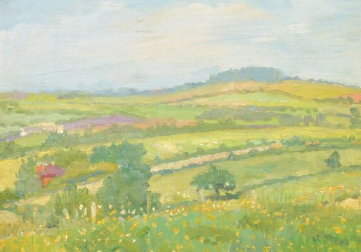 20th Century, A summer landscape with yellow flowers in the fields, oil on board, 11" x 15".