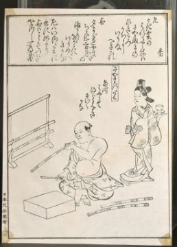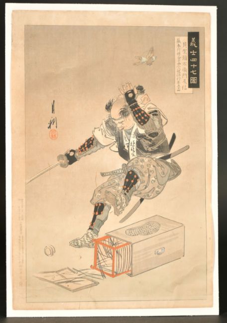 Japanese School, 19th Century, A colour woodblock of a warrior, signed and with inscription in left margin, 13.25" x 9.25" and four black and white scenes with figures, (unframed) (5).