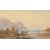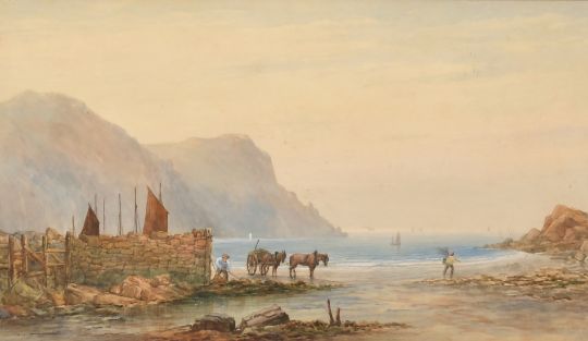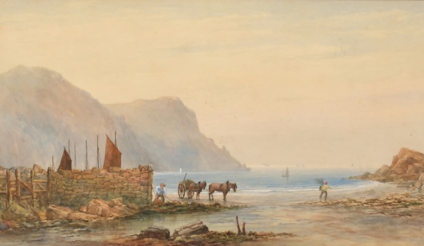 19th Century English School, figures and a horse and cart on a bay with a rocky headland beyond, 8.5" x 15".