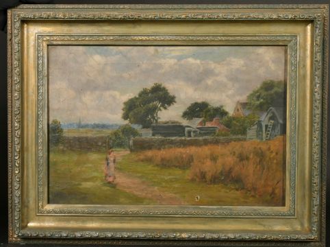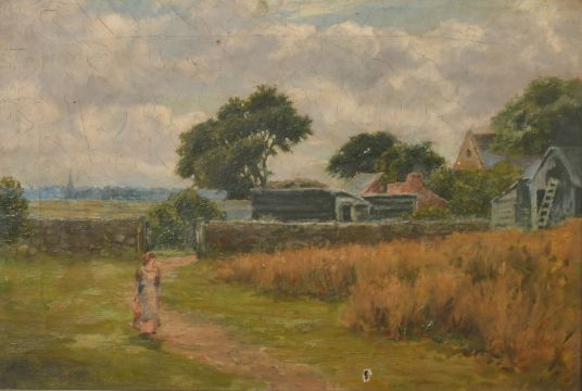 19th Century English School, a young maiden on a pathway by farm buildings, oil on canvas, 11" x 16" along with another by the same hand, 10" x 14".