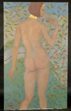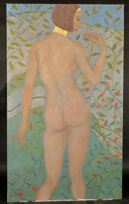 Kanwaldeep Singh Kang, signed Nicks, (1964-2000) British, a portrait of a standing female nude in a garden with trailing vines and red flowers, oil on canvas with applied gold paint, signed, 54" x 32", unframed, from the artist's studio collection.