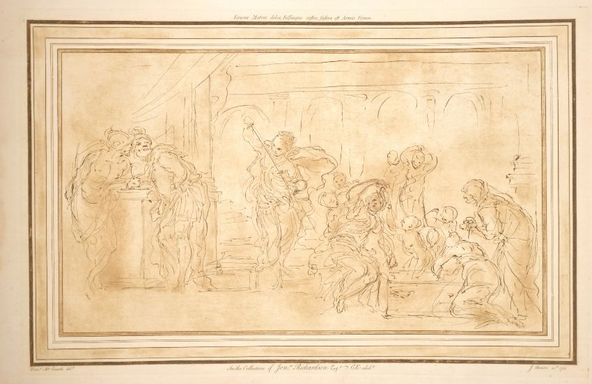 Basire after Canuti, A Historical event, antique sepia etching 11.75" x 18".