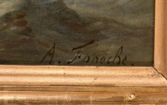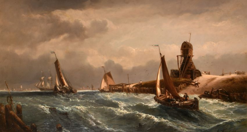 Andre Foneche (1851-1942) French, Busy shipping scenes off the Dutch coast in choppy seas, oils on canvas, both signed, 22.5" x 40.25". (2).