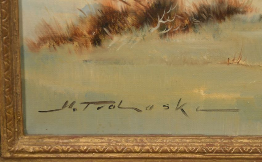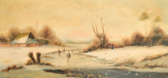 M. Trolaski (late 20th Century), Winter scene with figures skating on a frozen river, oil on canvas, signed, 20" x 40".