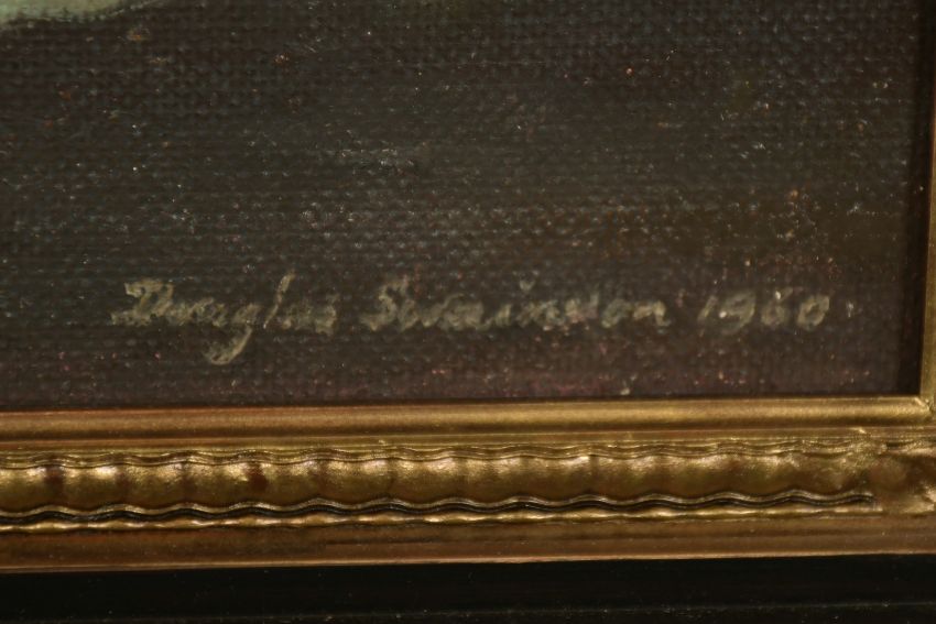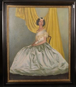 Douglas Swainson, 'The period Dress' A seated lady wearing a white dress, oil on board, signed and dated 1960, label verso, 30" x 25".