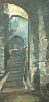 Eileen Seyd (20th Century) 'Steps to dream castle', oil on board, signed, 35.75" x 18".